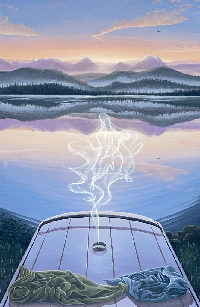 “I wait for the pungence of dairy farms to pass on the way to paradise. The clouds are taunting me today with a coy blush on the cornflower blanket, bruises on thin soymilk skin. The best colors as usual peek out in the west; then a right turn I didn’t want to take, and they are behind me. Driving into this bowl of mountains, I feel profoundly at home, although the jagged peaks punctuate the scene like a sickened dream. It’s flirtatious, the essence of cedarwood and sandalwood, lilacs along the fence, flowers on mossy trees, a spring-green fringe. A reminder to hold on to the precious magic of being myself, never mind how the other girls hated my denim and musk. I am radiating that which I wish to attract. Let all their faces be rubbed into it, they who dare taste the salt of my skin.”