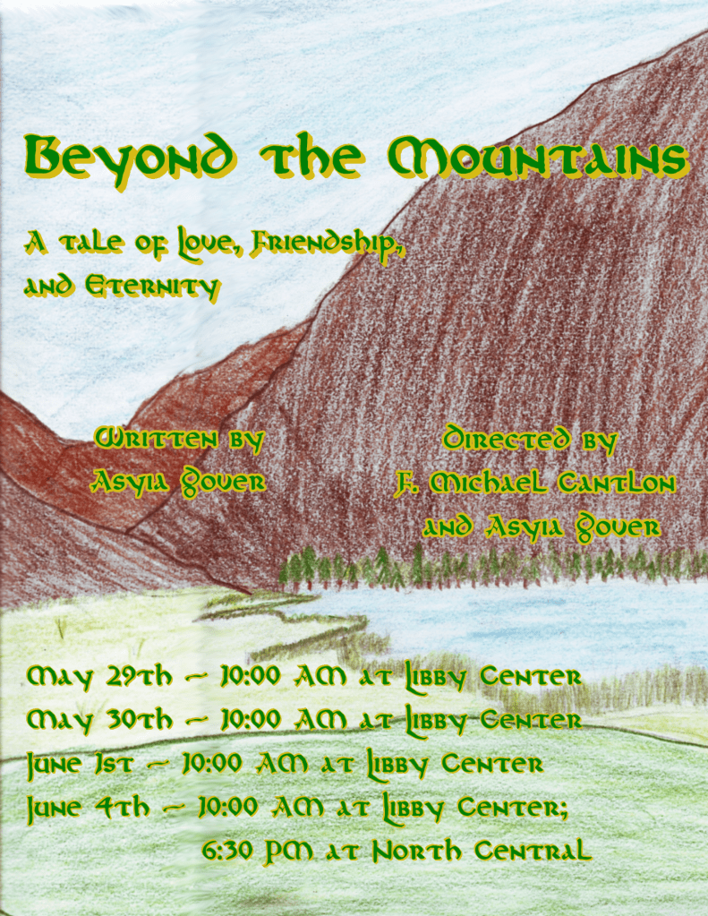 Beyond the Mountains was a stage play written by Asyia Gover for the theater class of Odyssey Middle School. Glen O’Malley, the son of an Irish hero long past his glory days, meets a mysterious lady who inspires him to strike out on his own, finally leaving his sleepy village and his monotonous farm life behind. Along the way, his courageous naivete catches the interest of some magical companions, who lead him to the secrets about this woman and her past that everyone except Glen seems to know. Does the couple run off into the sunset and live happily ever after? Or is there more to this story to which young love doesn’t speak? Find out as we accompany Glen on his coming-of-age journey Beyond the Mountains!